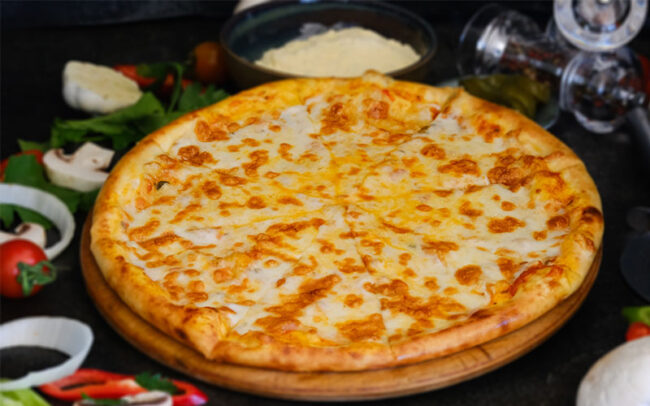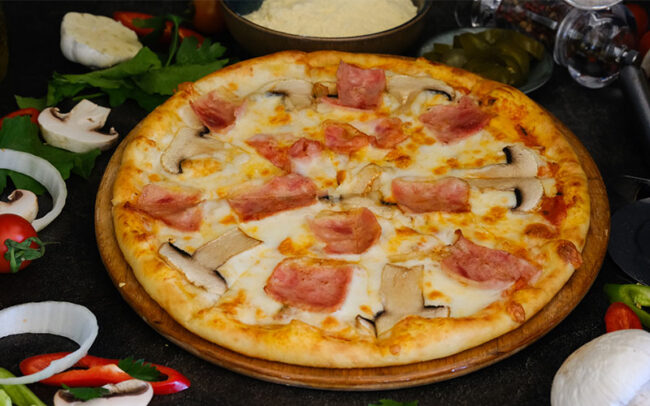 Folded pizza filled with bacon, mushrooms, cheese and our classic tomato sauce