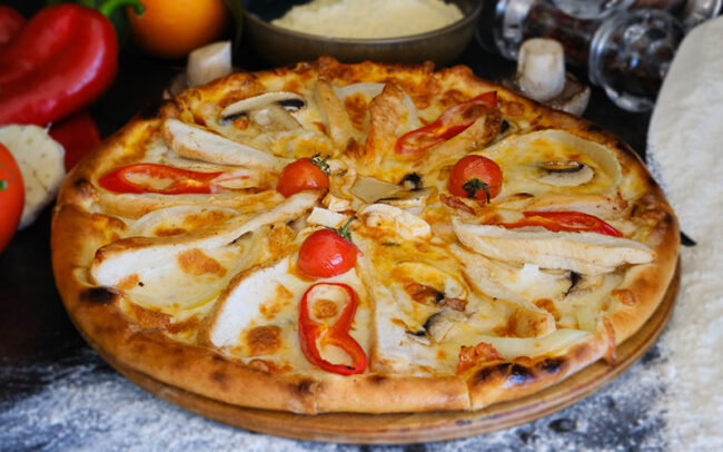 BBQ sauce, chicken, mozarella and capia pepper