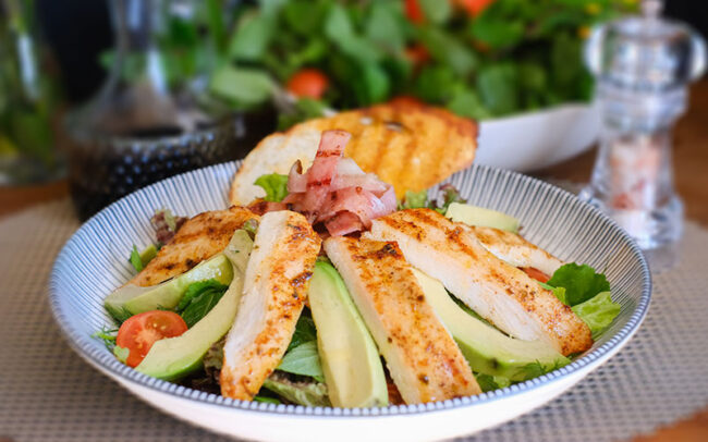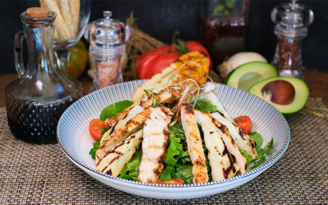 Grilled chicken, grilled halloumi cheese, seasonal greens
