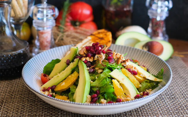 Seasonal greens, pomegranate, walnuts, avocado, orange, basi