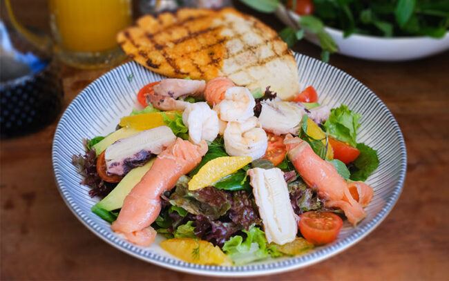 Seasonal salad with octopus, shrimps, smoked salmon, avocado, capers, cherry tomatoes, orange
