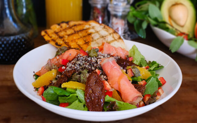 Salmon, quinoa, orange, sun-dried tomato, red onion, capers, seasonal greens